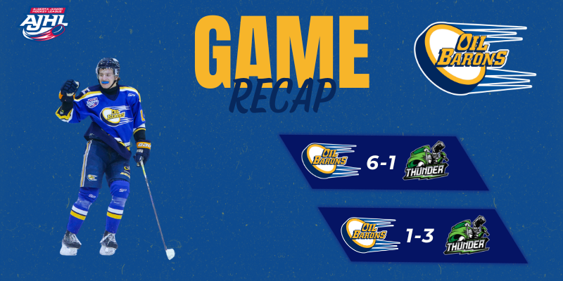 The Oil Barons had to settle for a weekend split with a weekend split against the Drayton Valley Thunder. Ryan Arnold extended his point streak to seven games, Justin Dumais surpassed 25 points on the season, while Brendan Gee was terrific in net stopping 50 of the 53 shots he faced.