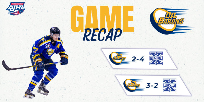 Friday saw the Oil Barons fall behind the eight ball and they were never able to fully recover. Ben Deacon opened the scoring with his 11th goal of the season. The rookie from St Albert rifled a shot off the crossbar and in to give Devon a 1-0 lead. The Xtreme added to their lead midway through the second period. After Brendan Gee stoned Joseph Stabile on a breakaway, Ryder Mead picked up the puck and filed it through the Oil Barons netminder. The MOB got a response. While on a 2-on-1 with Evan Benoit, Justin Dumais elected to shoot for his 10th goal of the season. However, Devon restored their two goal advantage. After what appeared to be an illegal high hit that went undetected, Nolan Eastwood fired a shot that went off the end of Gee’s glove and looped into the net, making it 3-1 Xtreme. The third period started with several miscues, with Fort McMurray struggling to create any chances, until their top goal scorer struck. Cole Brown, making his Oil Barons debut, forced a turnover. The puck slid to Dumais who found a wide open Ryan Arnold in the slot, and the veteran forward made no mistake for his 15th goal of the season. Fort McMurray pressed for an equalizer but were unable to convert, and Lucas Knorr added an empty net goal to seal the deal for the home side.