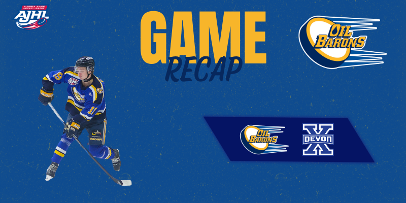 Devon struck early and often in the contest. Lucas Knorr opened the scoring 90 seconds into the game, poking home a centering feed from Jeremy Friesen. Ben Deacon made it 2-0. His shot from the slot squeezed its way through Claydon and trickled over the goal line. Lincoln Martin struck to make it 3-0 before the first intermission. The puck popped loose to the rookie forward and he backhanded it short side for his fifth goal of the year. The Oil Barons needed a spark to start the second period and they got it. Twelve seconds in, Ryan Arnold set up Lucas McDonald for his fifth goal of the season, cutting the Devon lead to 3-1. However, 33 seconds later, the Xtreme got the goal back. Knorr stepped in on breakaway, deking Claydon for his second goal of the game. A powerplay goal from Brynn Maclean made it 5-1 Devon. The defender let a wrist shot go from the blueline that found its way past a screened Claydon. Before the end of the period, Nolan Eastwood deflected home his sixth goal of the season to make it 6-1 Xtreme. Devon scored again early in the third period. Ben Deacon sniped home his second goal of the game. He leads all rookies in goals scored with 13 on the year. Leo Adams snapped home a goal on a breakaway with 10 seconds left, bringing us to the final score of 7-2.